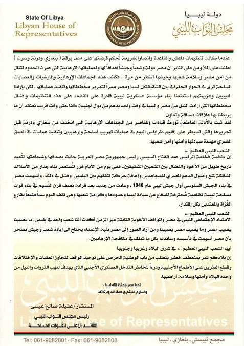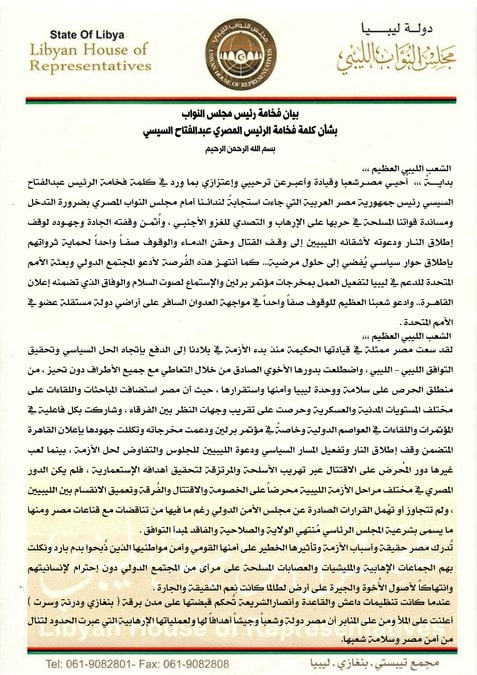 ووجه رسالة للشعب الليبي، أكد فيها أن مصر ممثلة في قيادتها الحكيمة منذ بدء الأزمة في ليبيا إلى الدفع باتجاه الحل السياسي وتحقيق التوافق الليبي الليبي واضطلعت بدورها الأخوي الصادق من خلال التعاطي مع جميع الأطراف دون تحيز من منطلق الحرص على وحدة وسلامة ليبيا وأمنها واستقرارها حيث أن مصر استضافت المباحثات واللقاءات على مختلف المستويات المدنية والعسكرية.