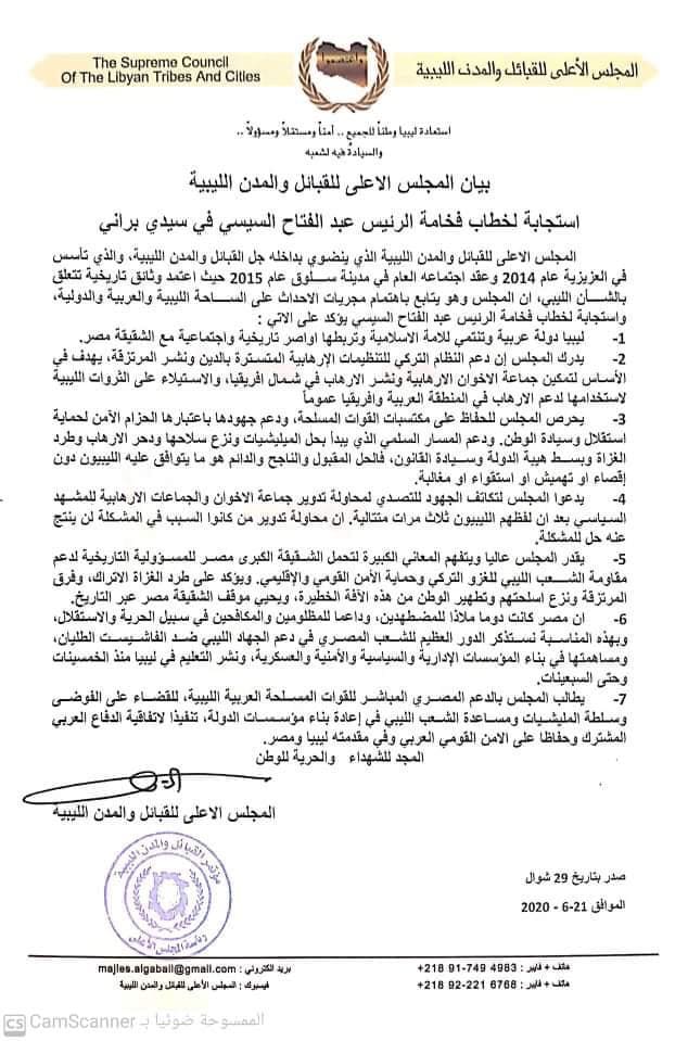 جاء ذلك في بيان للمجلس الأعلى للقبائل والمدن الليبية استجابة لخطاب الرئيس عبد الفتاح السيسي في سيدي براني.
