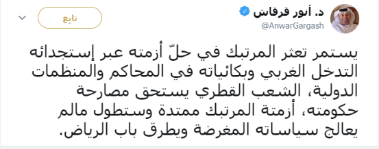 وقال قرقاش -في تغريدة له على موقع التواصل الاجتماعي (تويتر) “يستمر تعثر المرتبك في حل أزمته عبر استجدائه التدخل الغربي وبكائياته في المحاكم والمنظمات الدولية”، مضيفا أن “الشعب القطري يستحق مصارحة حكومته”.